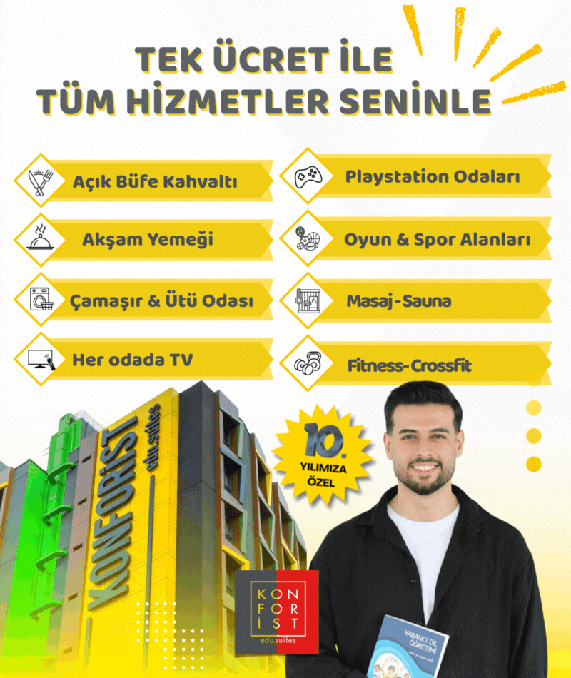 Konforist oda fiyatlarına; elektrik ve su faturaları, oda ısıtma/soğutma imkanları, eğitim destekli sınırsız internet, 2 adet spor salonu (fitness ve crossfit), sauna, cep sineması, gentleman club (PlayStation alanı), gamecenter (oyun odası), etüt odası, açık-kapalı teras (barbekü alanı), hobi mutfağı, çamaşır/ütü odası alanlarının ve bu alanlarda yer alan cihazların kullanımı ayrıca yatak, yastık, nevresim takımları ile birlikte haftada 1 gün detaylı temizlik, 1 gün çarşaf ve nevresim değişimi, günlük çöp toplama, bavul odası ve resepsiyon hizmetleri dahildir.